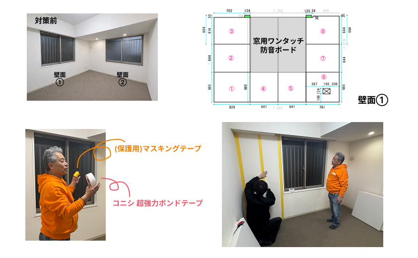 ▼【壁面①】直接面していないが、換気扇などの音が入りやすい壁①と窓①のビフォーアフター