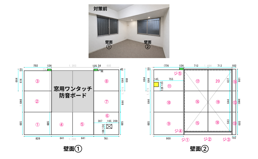 壁面①には、ピアリビングオリジナルの防音パネル『ワンタッチ防音壁』を設置して、窓①は取り外しができる防音ボード『窓用ワンタッチ防音ボード』を。