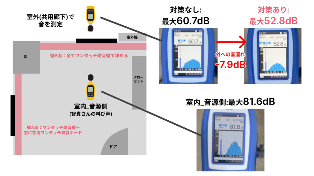 さらに、その音を共用廊下側で測定すると 60.7dBとなり、耳でもはっきりと叫び声が分かるレベルでした。一方、対策後は52.8dBとなり、対策前と比べて7.9dBの低下が確認できました。