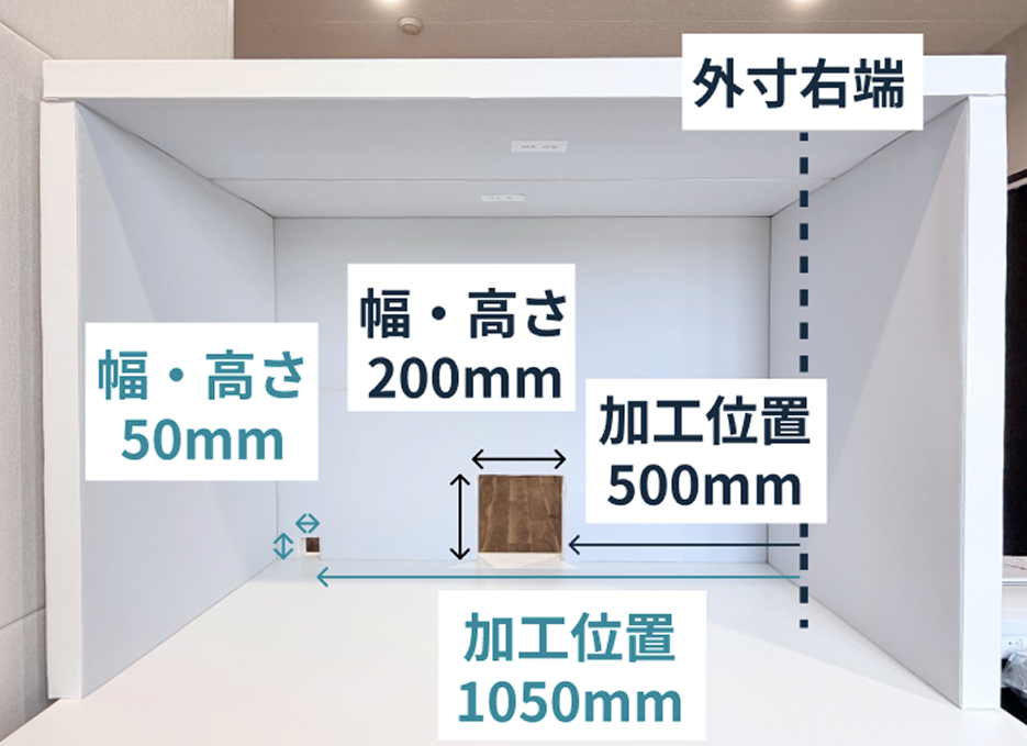 今回計測したデスクではモニターアーム部分の加工 を、200mm×200mmに加工するため、デスク右側から500mmの位置を指定。配線は50mm×50mmに加工し、デスクデスク右側から500mmの位置を指定するようにしました。