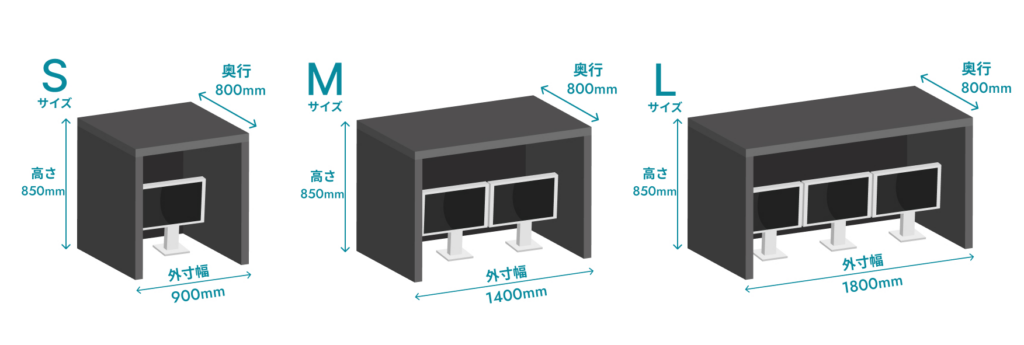 HISOHISOブースは、S・M・Lの3サイズ展開で、モニターの台数や作業スペースに合わせてお選びいただけます。