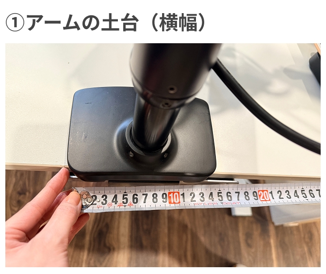 モニターアームを固定している土台の部分の横幅を確認しましょう。