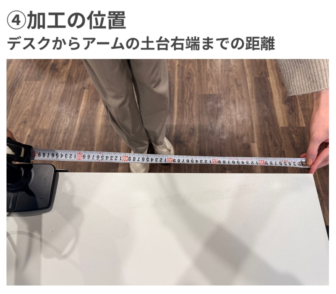 注文の際に外寸右端から加工本体右端までの距離を指定するため、デスクからアームの土台右端までの距離を測りましょう。