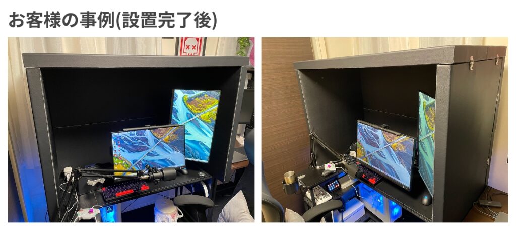 このようなデュアルモニターを使用している場合、モニターアームの肘の部分がブースの内側に干渉する可能性があるため、「アームを内側にたたむことができるか」など事前に確認が必要です。実際のお客様の事例を元にご紹介します。