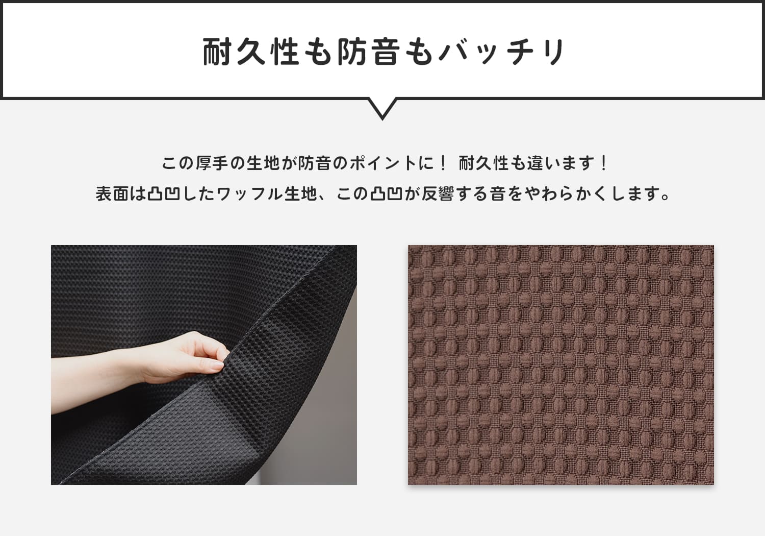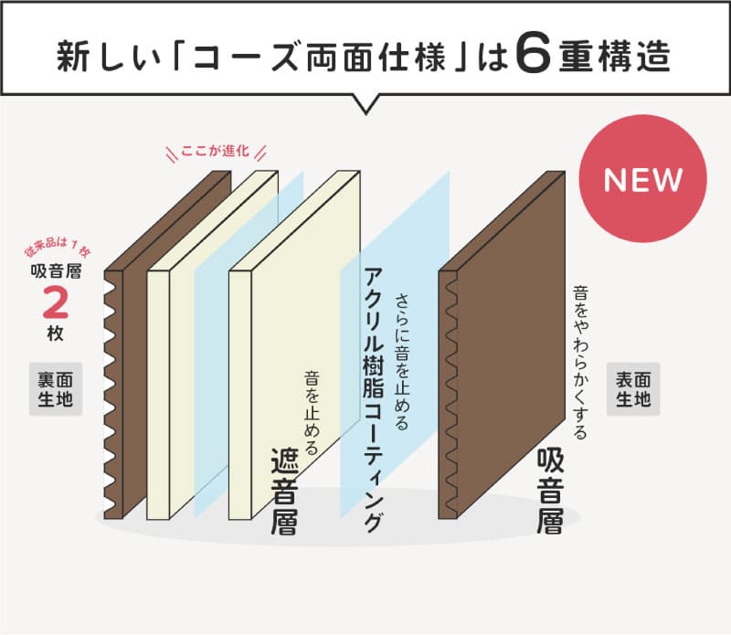 なんと今回、裏面にさらに「吸音生地」が重なった、六重構造の両面仕様防音カーテンが出来ました!