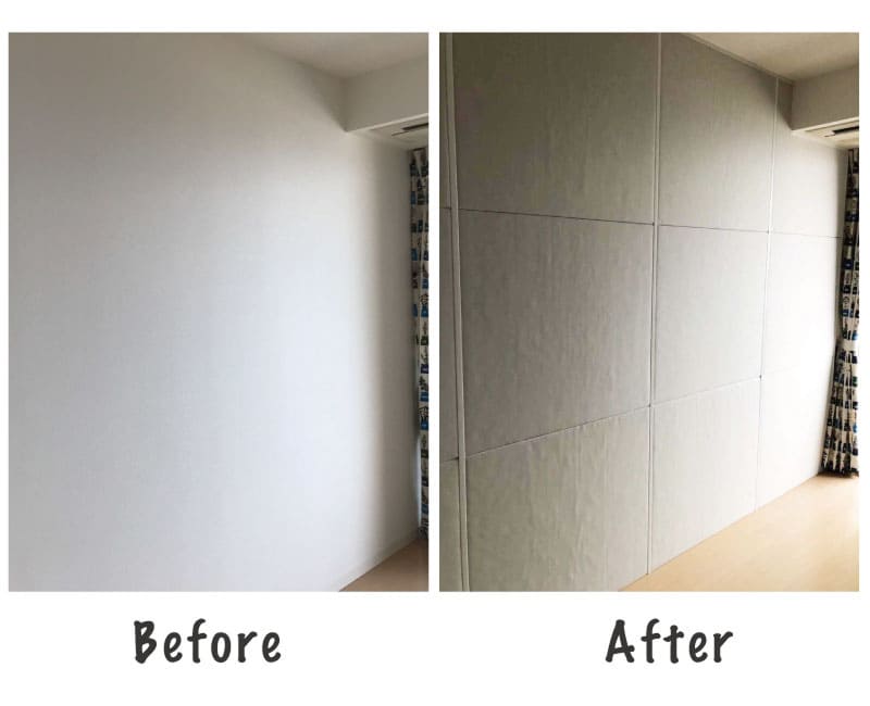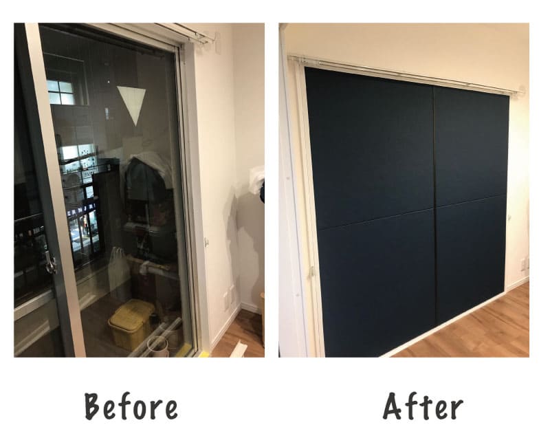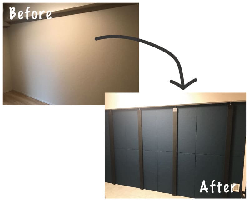 - 使用した材料:ワンタッチ防音壁 スタンダード 拭ける壁紙調クロス(ダークネイビー) 8枚 ラブリコ 5本