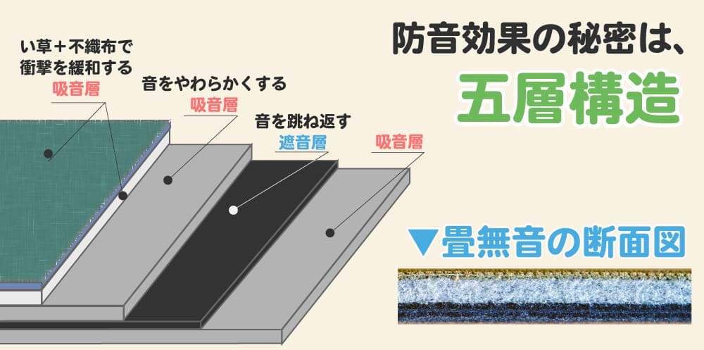 「足音マット」は、足音などの振動を吸収して軽減できるように三層構造になっており、畳のクッション性と合わさることで、さらに高い防振効果が期待できます。