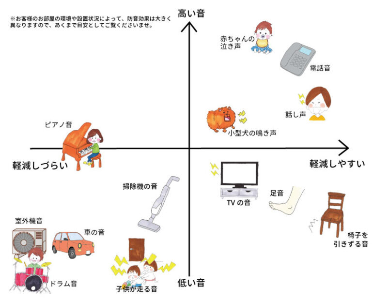 音には様々な種類があり、それぞれ周波数が異なります。一般的に、低音域の音(例えば、ドラムの重低音やベースの音)は、中・高音域の音(例えば、金管楽器の音や人の話し声)に比べて遮断するのが難しいとされています。