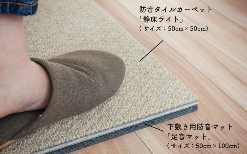 当店だと、防音タイルカーペット「静床ライト」と下敷き用防音マット「足音マット」の組み合わせがおすすめです。適度な厚みとクッション性で、床への衝撃をやんわり受け止めます。
