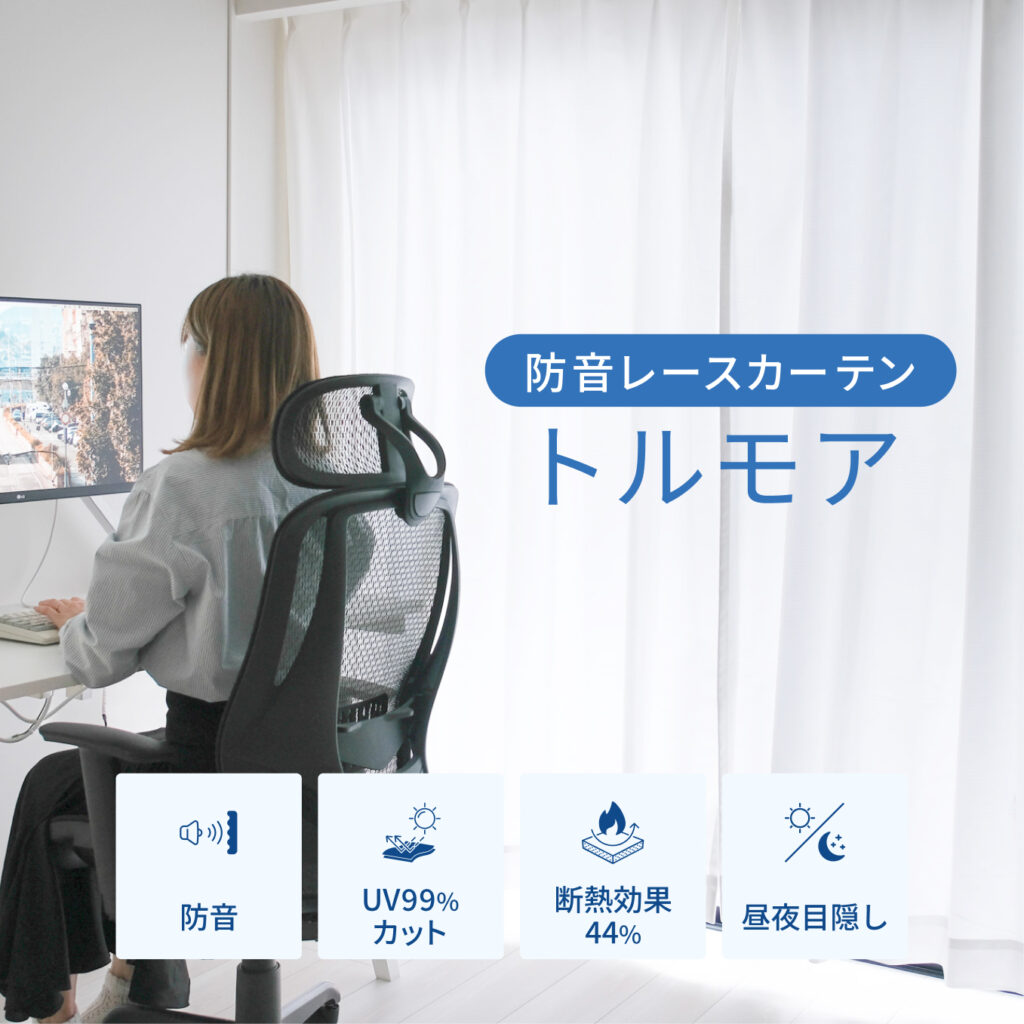 高密度の3層構造生地が、室内から漏れる音を和らげます。防音レースカーテン「トルモア」を設置することで、室内からの音漏れを防ぐことが出来ます。
