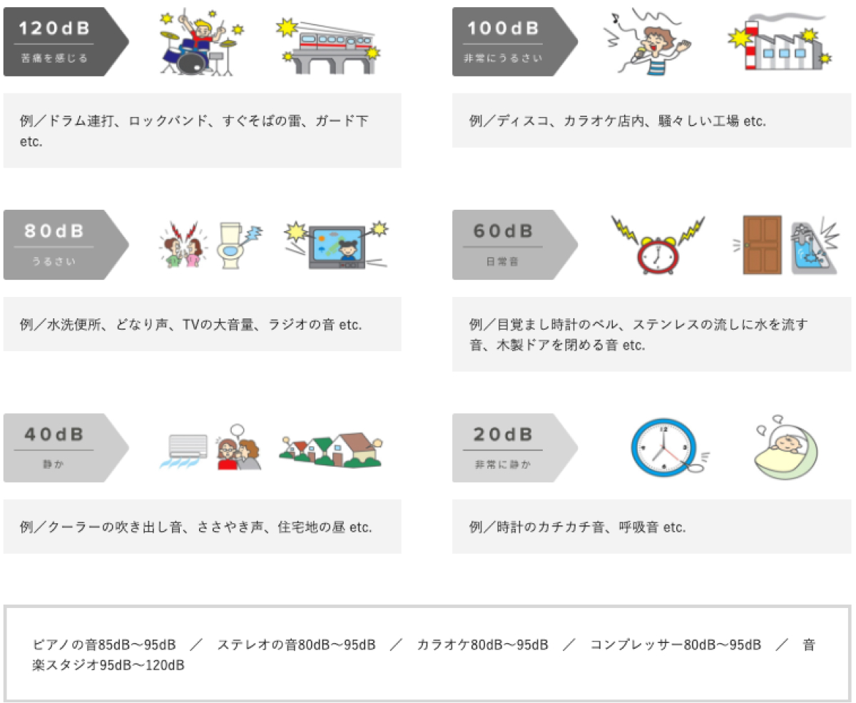 それに対して、生活音はだいたい60dB~80dB以上で、うるさいな~~と感じる音は100dB以上にもなります。