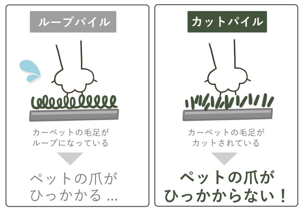 静床プレミアは、パイル(表面の毛の形状)がカット状になっており、ペットの爪が引っ掛かりません。