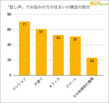 また、「話し声」でお悩みの方のお住まいの建物も、アパート、マンション、一戸建てなどさまざまです。件数に多少の差はありますが、どの建物でも話し声の音漏れに悩んでいる方が多いことがわかります。