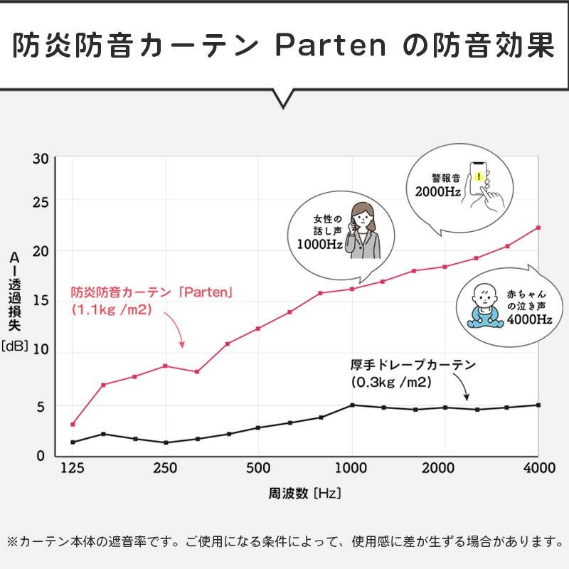防音カーテンParten(パーテン)は、人の話し声程度の音であれば平均して5-12dBほどの遮音効果が期待できます。