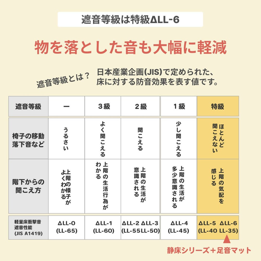 「静床ライト」と「足音マット」を重ねて使用することで、軽量床衝撃音の遮音等級は、最高レベルの「ΔLL-6」が期待できます。