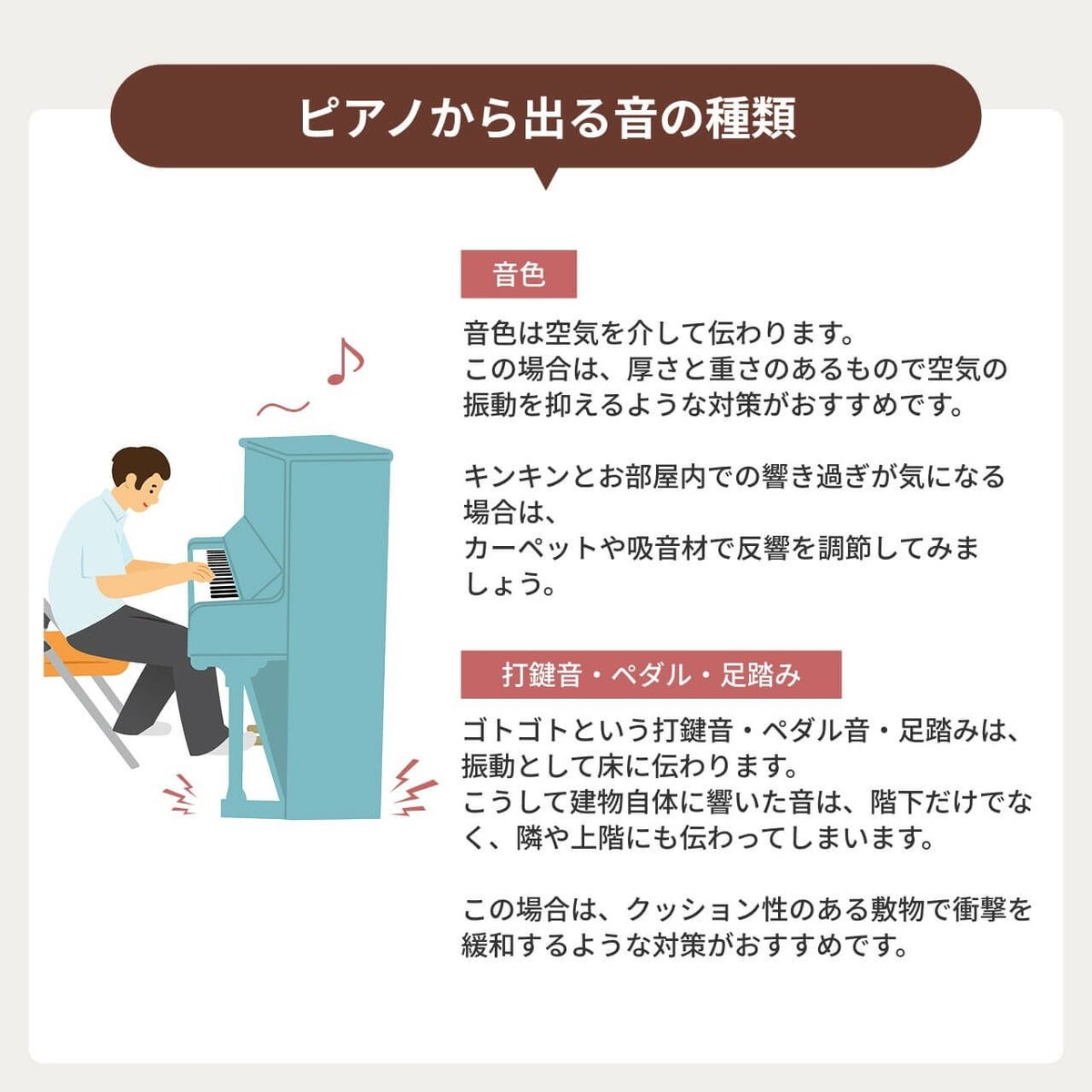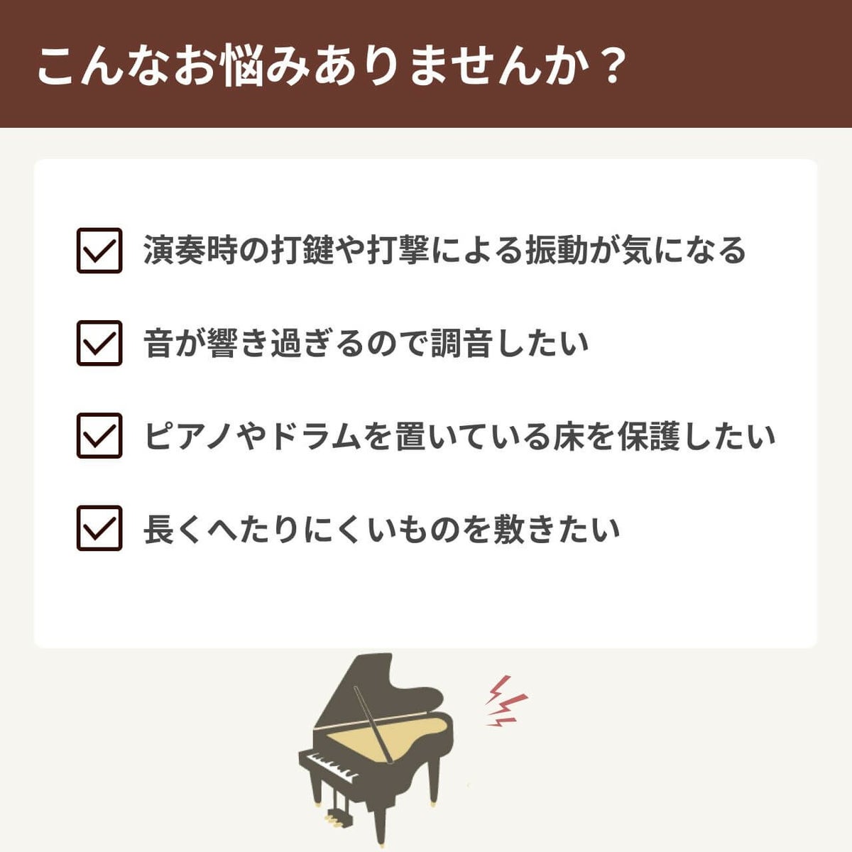 特にグランドピアノは音が発生する響板も下側に配置されているため、床や下の階に音が響きやすく、床への防音対策が重要となります。