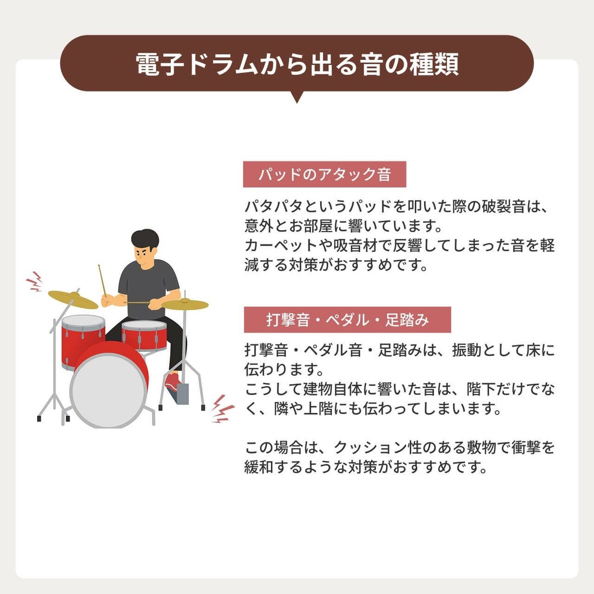 電子ドラムは基本的に、音はイヤフォンをヘッドフォンをつけて演奏する場合が多く、それほど音漏れしてないように感じやすいのですが、意外と振動や打鍵音は近隣や階下に伝わってしまいます。