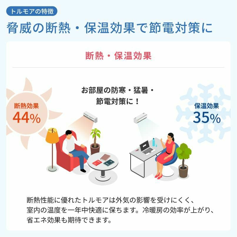 防音レースカーテン「トルモア」は、レースカーテン史上最厚の三層構造生地による防音・遮音・断熱レースカーテンです。お部屋の温度を適切に保ち、節電・省エネ効果が期待できます。