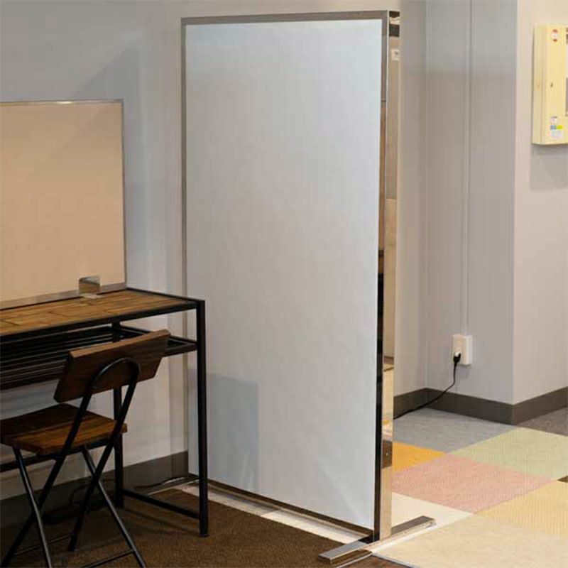 パーテーションの表面は、音響室でも使用されている吸音効果の高い「ファインヴェールクロス」を使用し、転倒防止のため、ステンレス鋼フレームでしっかりと固定しました。