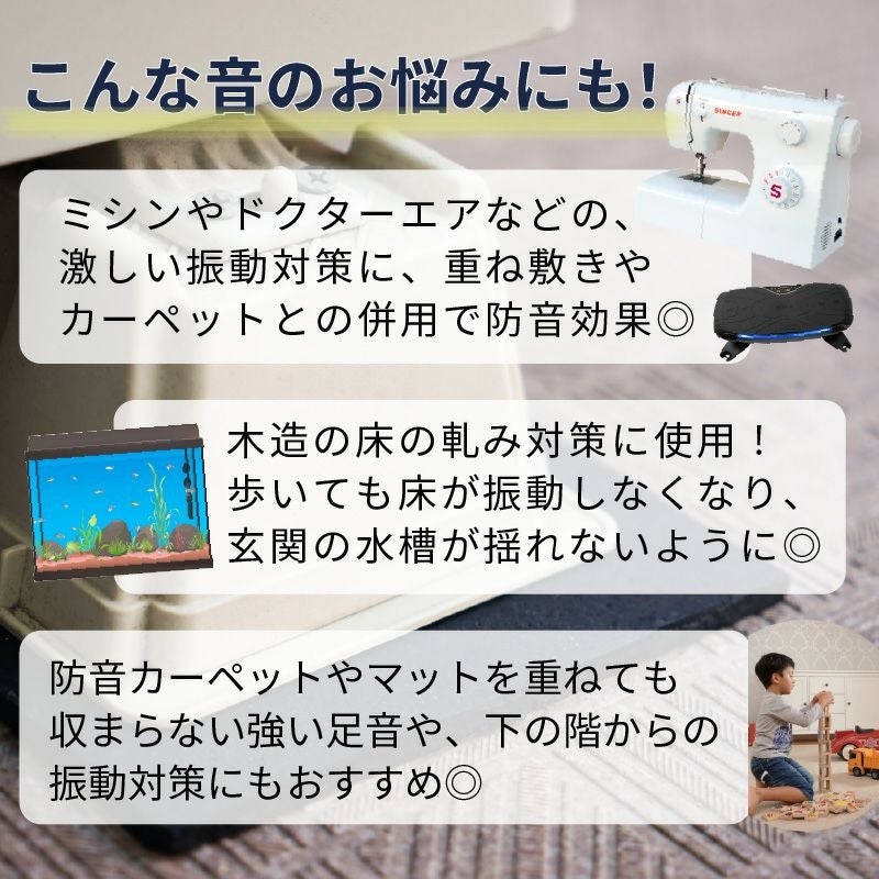 お部屋ぴったりに敷き詰めることも、防音したい箇所に合わせて自由に設置することもできます。余ったら、細かい場所の振動対策にもお使いいただけます。