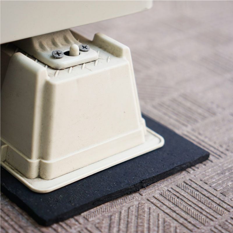 P防振マットは、他の防音マットよりに比べて耐久性があり、水周りや屋外での防音にオススメです。洗濯機や室外機の下に敷くことができます。