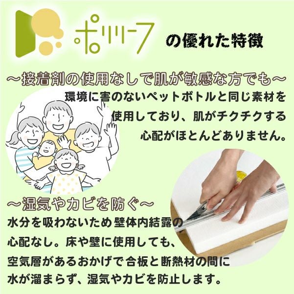 ポリリーフは、接着剤を使用しておらず、肌が敏感な方でもお使いいただけます。環境に害のないペットボトルと同じ素材を使用しており、肌がチクチクする心配がほとんどありません。