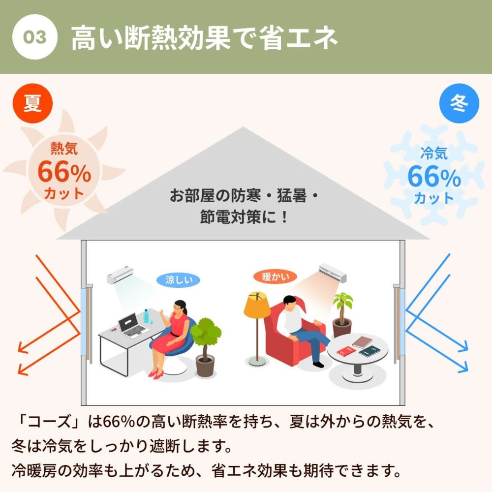 「コーズ」は66%の高い断熱率を持ち、遮音布2枚と吸音布の計3層構造に加えて、高密度生地を使用しています。これにより、生地の間にできる空気層が断熱材のように働き、夏は外からの熱気を、冬は冷気を遮断することで室内の温度を一年中快適に保ちます。
