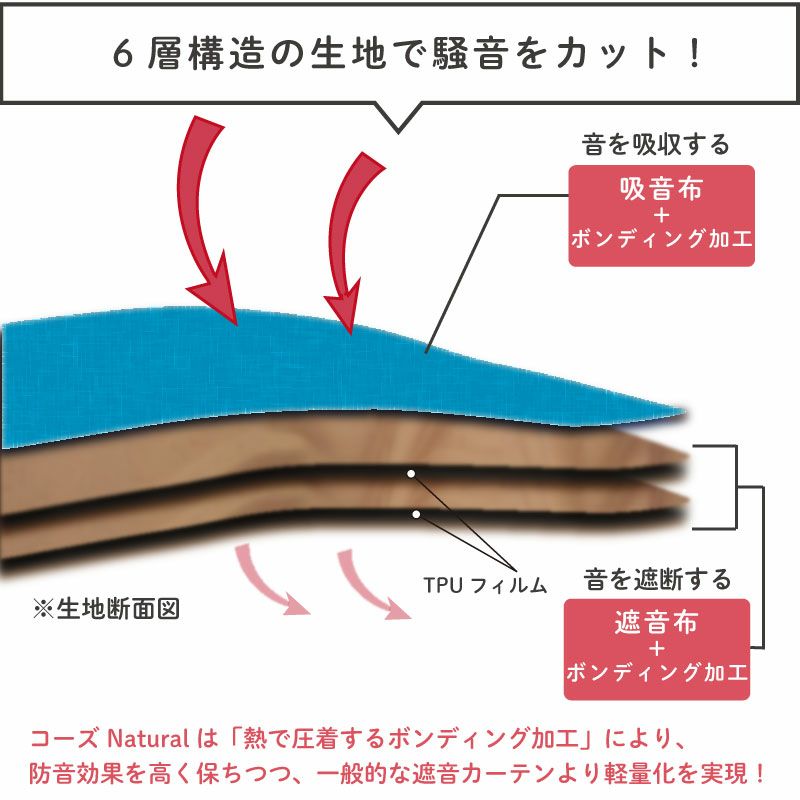 防音カーテンコーズ Natural(ナチュラル)は、音を吸収する「吸音布」と音を遮断する「遮音布」を組み合わせて作られています。
