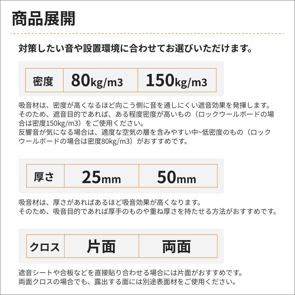 吸音材には、「密度」と「厚み」という違いがあります。「密度」と「厚み」はそれぞれ吸音効果や防音効果に密接に関係していますので、目的にあった種類の吸音材をご選択下さい。