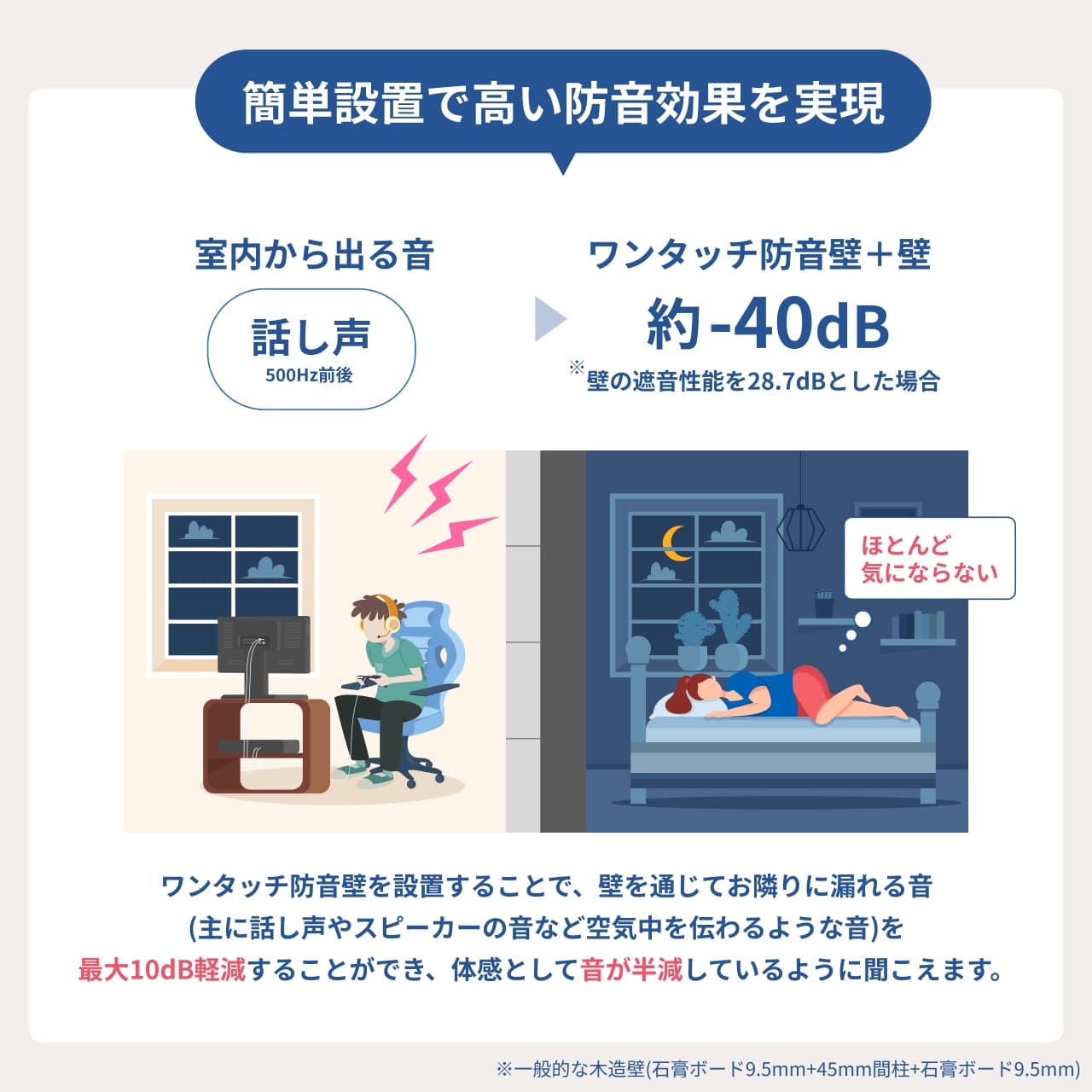 ワンタッチ防音壁を設置することで、壁を通じてお隣に漏れる音(※主に話し声やスピーカーの音など、空気中を伝わるような音に対して)を、最大10dB程度軽減することができ、体感として音が半減しているように聞こえます。