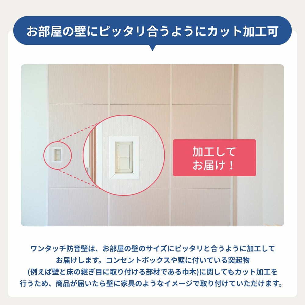 ワンタッチ防音壁は、お部屋の壁のサイズにピッタリと合うように加工してお届けします。コンセントボックスや、壁に付いている突起物(※例えば、壁と床の継ぎ目に取り付ける部材である巾木)に関しても、カット加工を行うため、商品が届いたら壁に家具を設置するように取り付けていただけます。