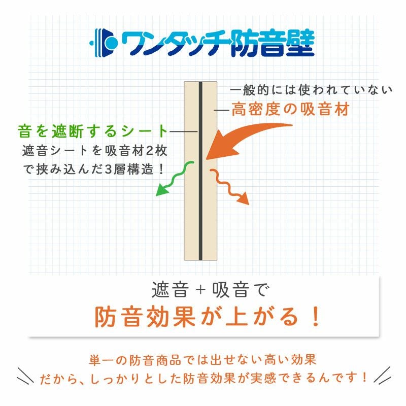 ワンタッチ防音壁は、発生した音を吸収する「吸音材」 とお隣への音を遮断する「遮音材」を組み合わせたサンドイッチ構造になっています。吸音と遮音を組み合わせて使用することで、防音効果を高めます。