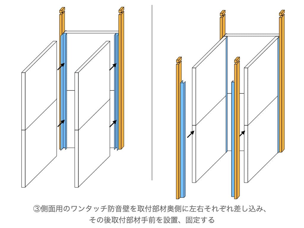 3. 側面用のワンタッチ防音壁を取付部材奥側に左右それぞれ差し込み、