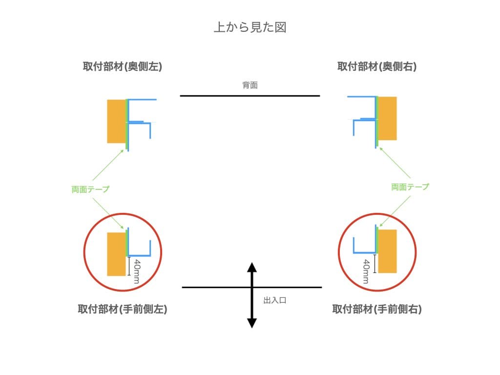 防音ボードで塞ぐ場合は、下のイラストのように手前側2本のラブリコを手前に40mmずらした形でジョイナーと貼り合わせます。