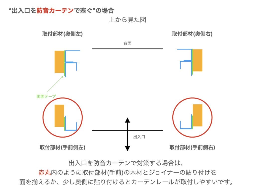 ★出入口を防音カーテンで対策する場合は、 赤丸内のように取付部材(手前)の木材とジョイナーの貼り付けを 面を揃えるか、少し奥側に貼り付けるとカーテンレールが取付しやすいです。