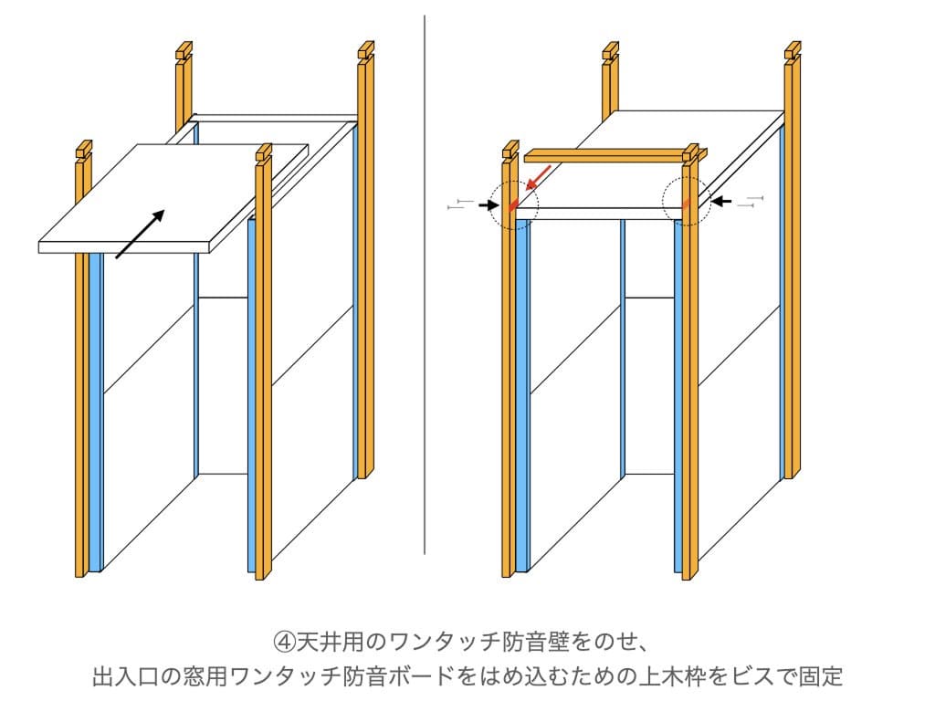 4. 天井用のワンタッチ防音壁をのせ、 出入口の窓用ワンタッチ防音ボードをはめ込むための上木枠をビスで固定