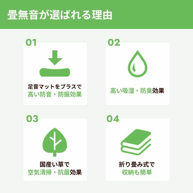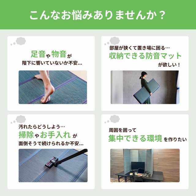 他の画像を見る パーテーションとしても使える、折り畳める防音たたみです。持ち運びや収納も簡単に出来ます。 折り畳める防音たたみ 「畳無音 -たたむね-」 100cm×200cm×18mm厚 価格 ¥ 23,100 税込 お気に入りに登録する