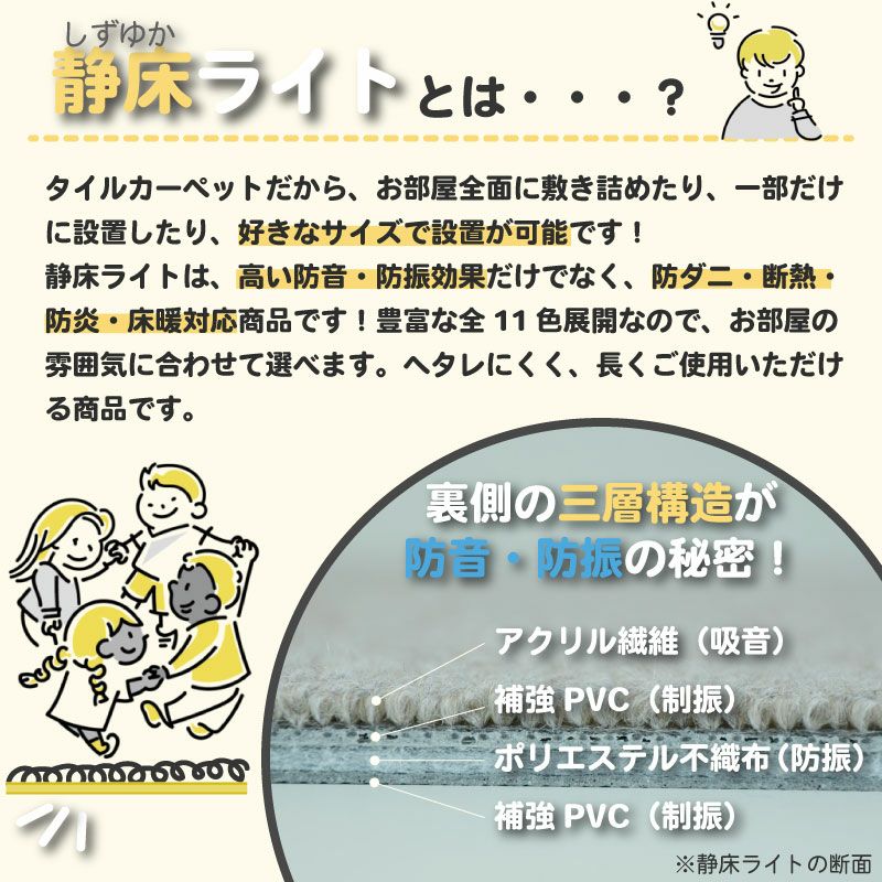 他の画像を見る 敷くだけ簡単!当店一番人気の防音タイルカーペット 【訳あり品】防音タイルカーペット 静床ライト 2枚セット 定価 ¥ 3,619 のところ、訳あり品のため 特別価格 ¥ 2,530 税込 販売を終了しました。 お気に入りに登録する