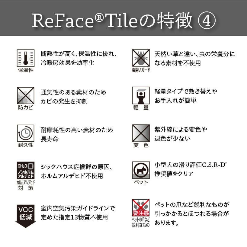 他の画像を見る 1枚で防音も耐水も防炎も!全て叶える万能な和モダンマット 防音フロアタイル ReFace Tile(リフェイスタイル) 45cm×45cm×12mm厚 1枚 価格 ¥ 4,620 税込 お気に入りに登録する